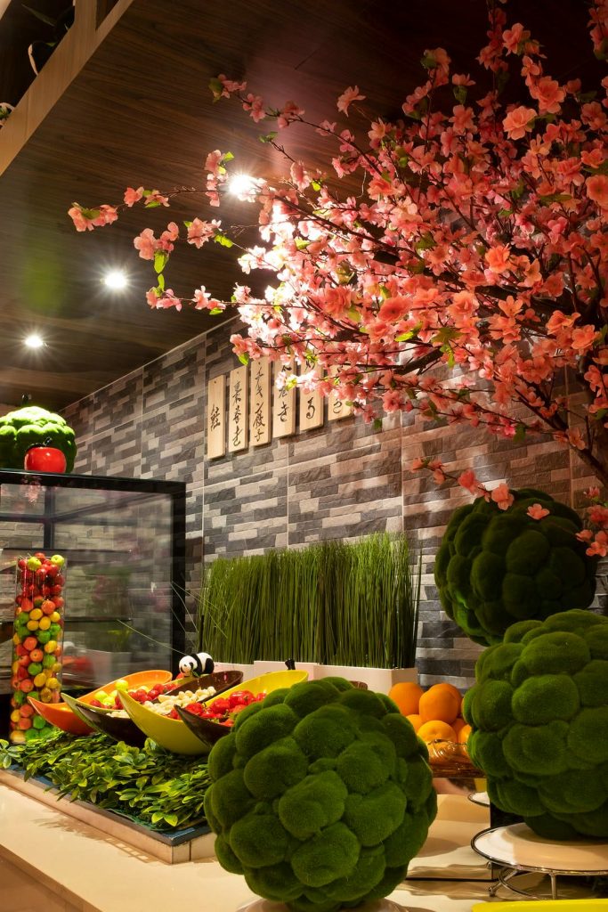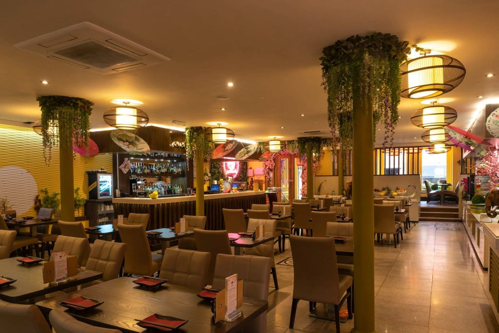 The seating arrangement is designed to accommodate both small and large groups, with options for intimate dining as well as communal tables for a more social experience. The open kitchen concept allows diners to watch the skilled chefs at work, adding an element of excitement to the dining experience.