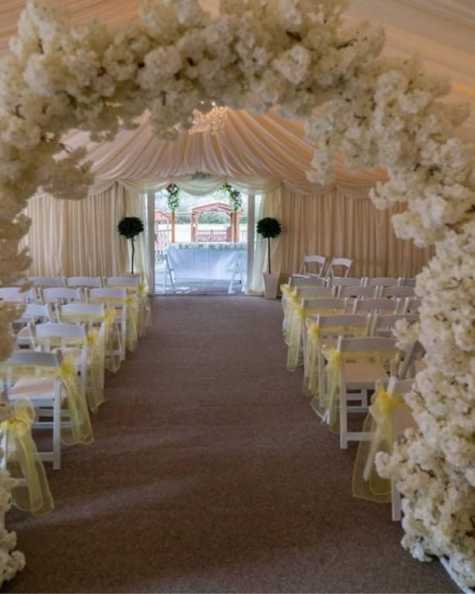 For those who prefer an indoor setting, our elegantly appointed reception area is ideal for hosting your wedding reception. The space is versatile and can be arranged to suit your needs, whether you envision a grand banquet or a more intimate gathering.